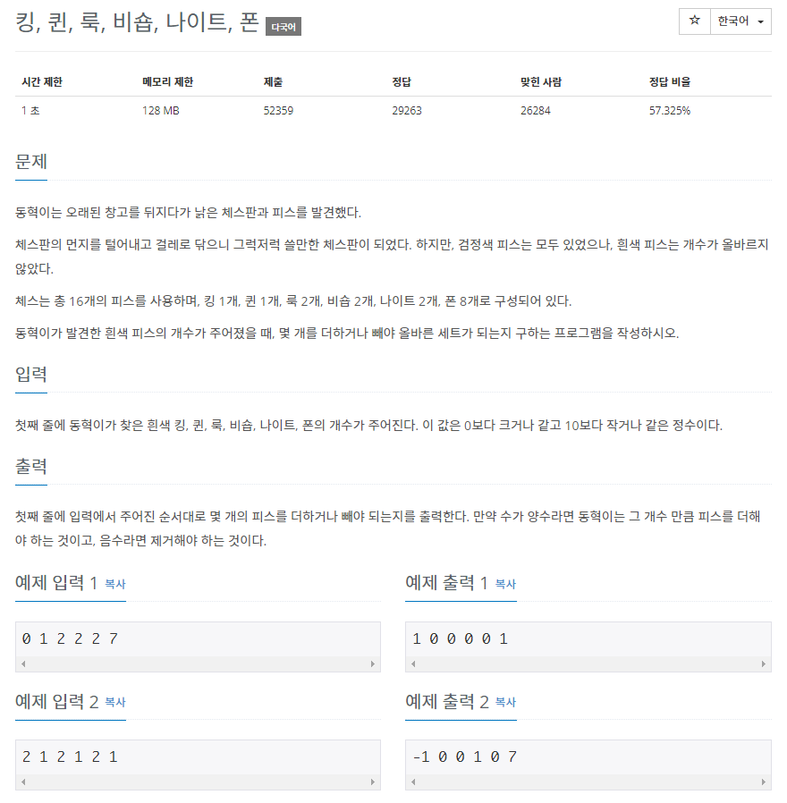 | [C++] 백준 3003번 - 킹, 퀸, 룩, 비숍, 나이트, 폰 (0) | 2022.11.21 |