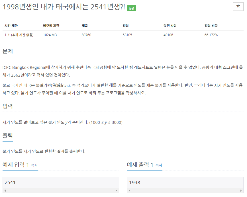 | [C++] 백준 18108번 - 1998년인생인 내가 태국에서는 2541년생?! (0) | 2022.11.21 |